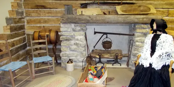 Log cabins were the first homes for most early settlers. Although our cabin is built of hand news barn beams, it represents the typical size and furnishings of these early homes. This cradle was hand made in the Carolinas about 1790 and was brought here by the family about 1810.